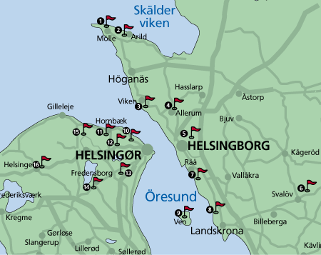 | Spelar du golf? I så fall har du kommit till rätt destination. Om du sätter en passare mitt i Öresund - sundet mellan Helsingborg och Helsingör, når du 48 banor inom en radie av femtio kilometer, 31 av dem, inklusive 4 pay & play, ligger på den svenska sidan. Nära Helsingör finns 17 golfbanor. |
