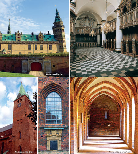 | Kronborg - Hamlets slott Tack vare Shakespeares Hamlet är Kronborg en av Danmarks mest kända byggnader och numera även med på UNESCOS lista över världens kulturarv. Den som idag besöker slottet, kan återfinna mycket av dess forna prakt och storhet. Här finns Nordens största riddarsal, en vacker slottskyrka, mäktiga bastioner, Rådssalen med de sju kungliga gobelängerna och de ohyggliga och mörka fängelsehålorna kasematterna där den nationella hjälten Holger Danske välkomnar sina besökare. Kronborgs kanonutsikt Från slottets största torn kan man njuta av en fantastisk utsikt över Öresund och Skåne. Man har också möjlighet att beskåda Kronborgs kanoner som är de äldsta i världen som fortfarande är i bruk. De används bland annat på drottningens födelsedag. ![]() Hamlet Sommer I augusti varje år arrangeras Hamlet Sommer på Kronborg. Det är ett festspel med danska och internationella uppsättningar av Shakespeares klassiska drama om prins Hamlet. Under årens lopp har många stora skådespelare stått på scenen på Kronborgs borggård. Karmeliterklostret och Sct. Mariæ kyrka Klostret grundades år 1430 och är en av de vackraste och mest välbevarade klosteranläggningarna i norra Europa. Här går man genom klostergångar, musikrum och refektoriet. I Sct Mariæ kyrka finns fina välbevarade väggmålningar och den nyligen renoverade orgeln som Buxtehude, den tyska kompositörens spelade på när han var organist här under 1660-talet. Domkyrkan Sct. Olai Den äldsta delen av kyrkan är från 1200-talet, men den fullbordades inte förrän 1480-1559. Barockstilen präglar interiören. Det karakteristiska kyrktornet är 68 meter högt. |